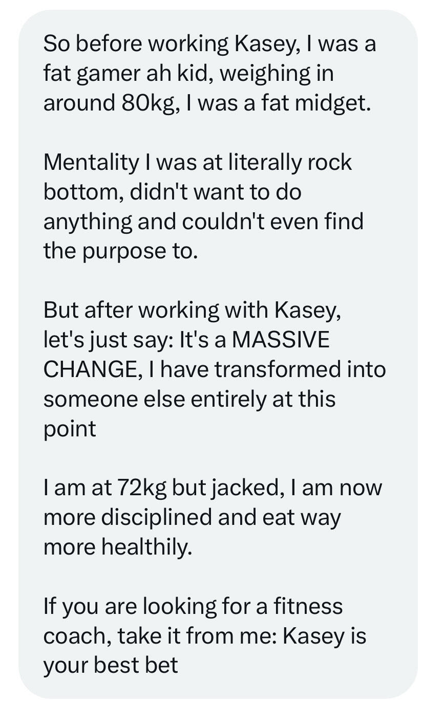 With my 1-1 approach we'll combine effective strategies and real world wisdom to reshape your life: Giving you the aesthetic, confident, and strong body you deserve in your 20s.