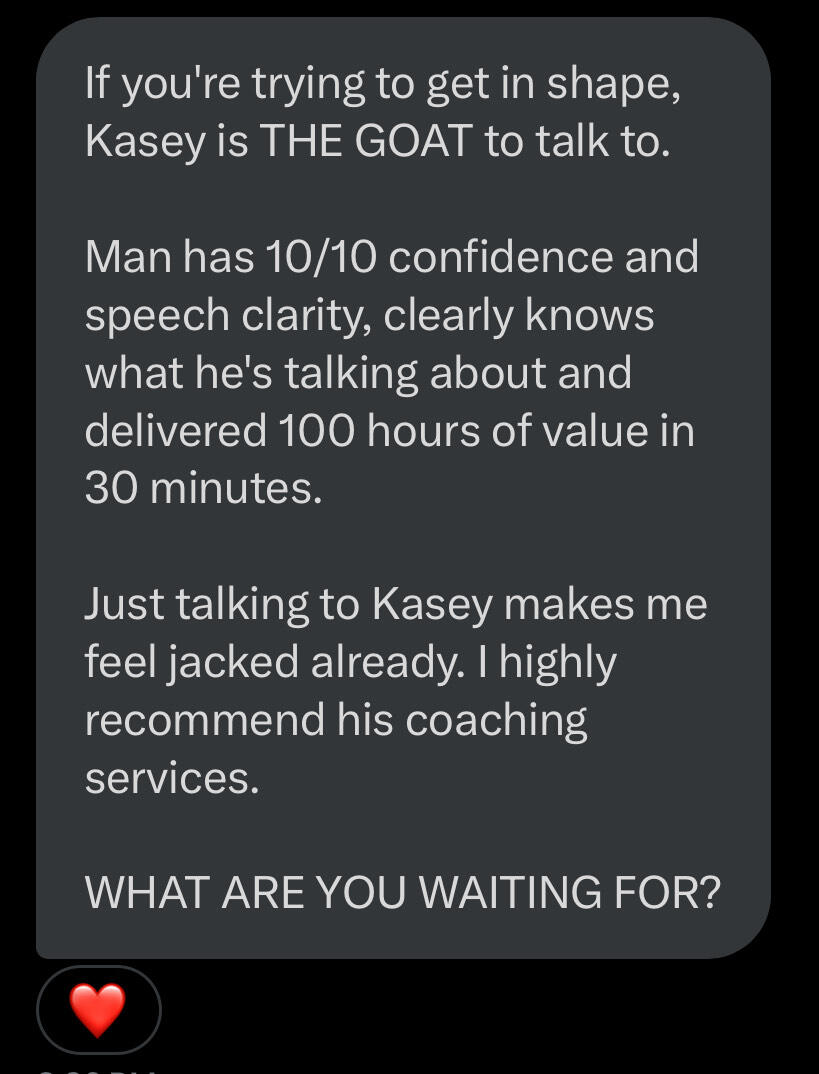 With my 1-1 approach we'll combine effective strategies and real world wisdom to reshape your life: Giving you the aesthetic, confident, and strong body you deserve in your 20s.